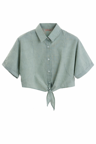 کراپ شومیز گره ای چهارخونه آستین کوتاه از جنس پارچه تترون